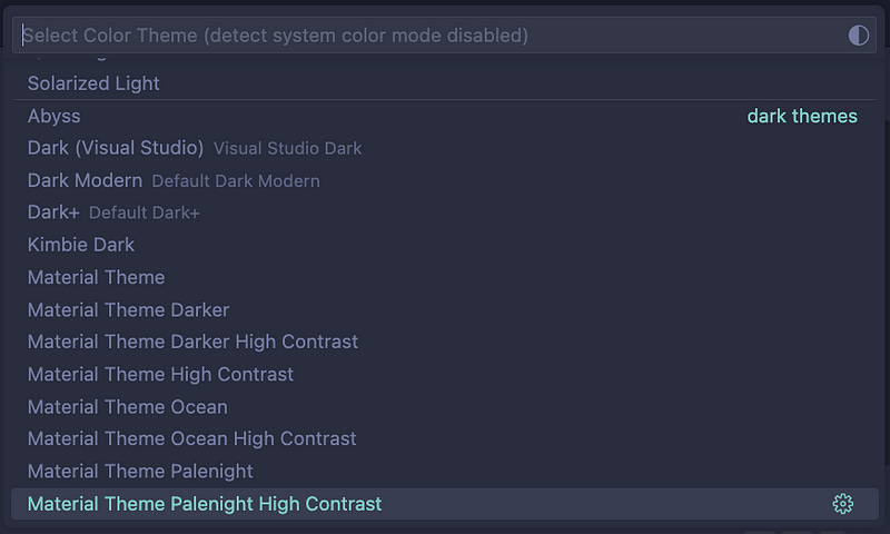 After installation, hit Cmd + Shift + P (Ctrl + Shift + P on Windows), search for “theme” and open “Preferences: Color Theme”. Here, you’ll see all the available themes. The ones starting with Material Theme are the ones we installed via extensions.