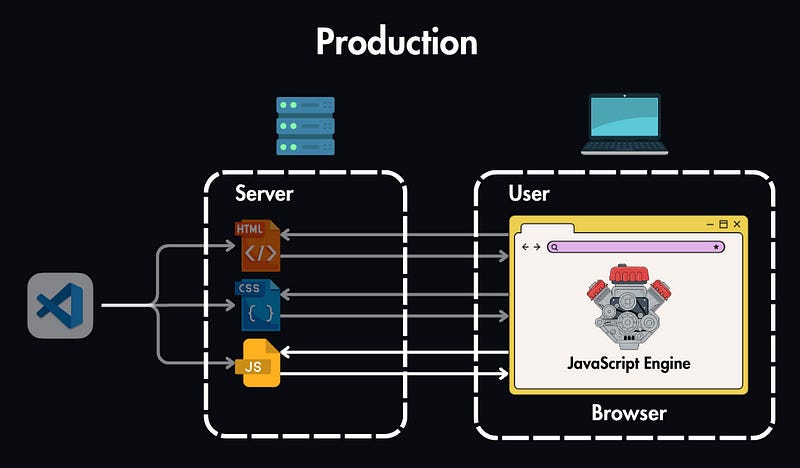JavaScript Engine: Just like in development, the browser’s JavaScript engine then reads and executes your code, creating an interactive experience for the user.