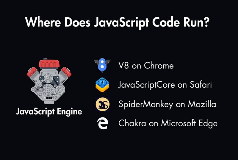JavaScript was initially designed to run within web browsers. Each browser has a JavaScript engine (like V8 in Chrome, JavaScriptCore in Safari, SpiderMonkey in Mozilla, or Chakra in Microsoft Edge)