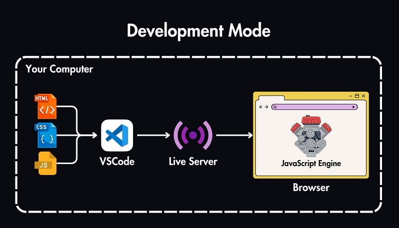 When you write and test your code during development, you’ll typically use tools like the Live Server extension in VS Code. We call this a development mode, meaning that we run it on our own computer, and our files are not yet optimized for the production server.