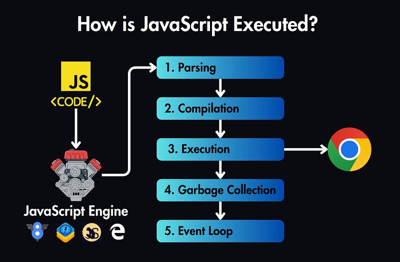 Compilation: Modern JavaScript engines like V8 (used in Chrome and Node.js) use a technique called Just-In-Time (JIT) compilation. This involves compiling JavaScript code into machine code at runtime.