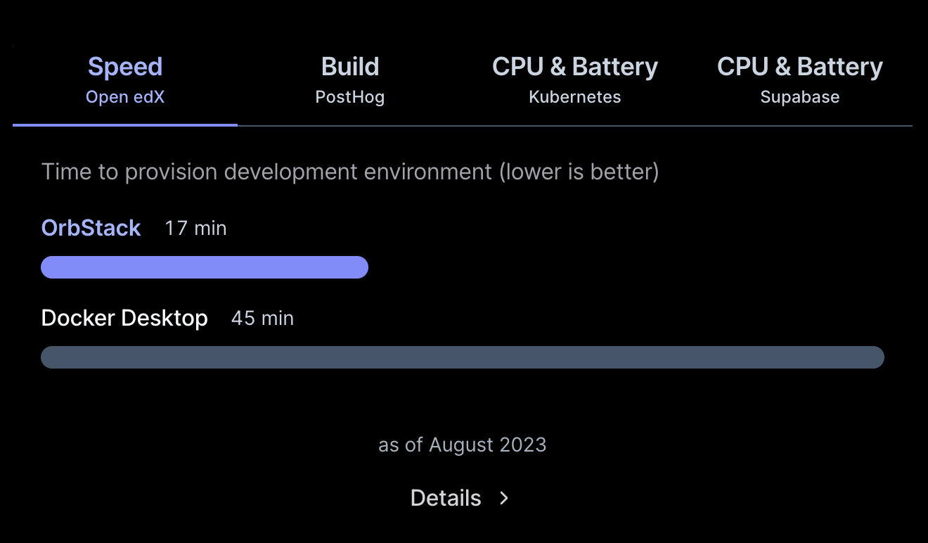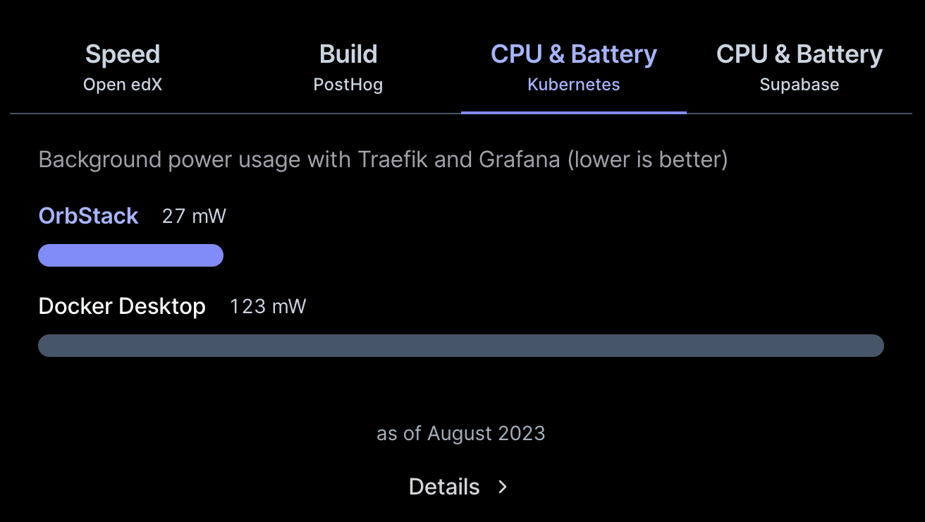 💨 Lightweight. It consumes low CPU and disk usage, and it’s battery-friendly compared to Docker Desktop.