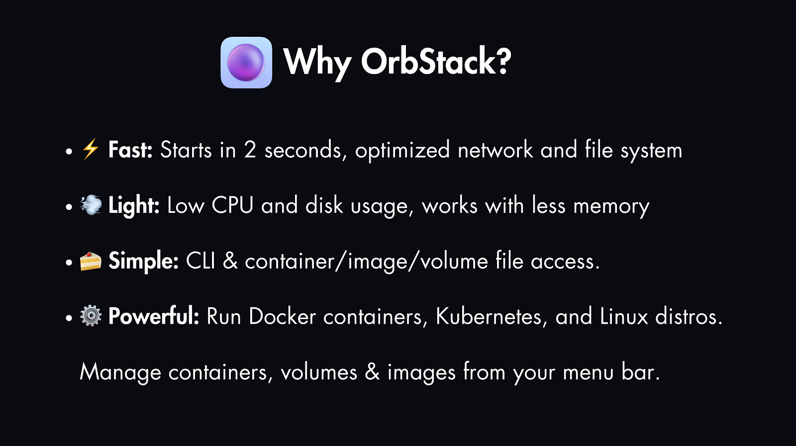There are several compelling reasons to use Orbstack, but the main ones are: